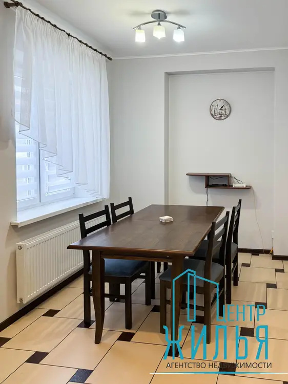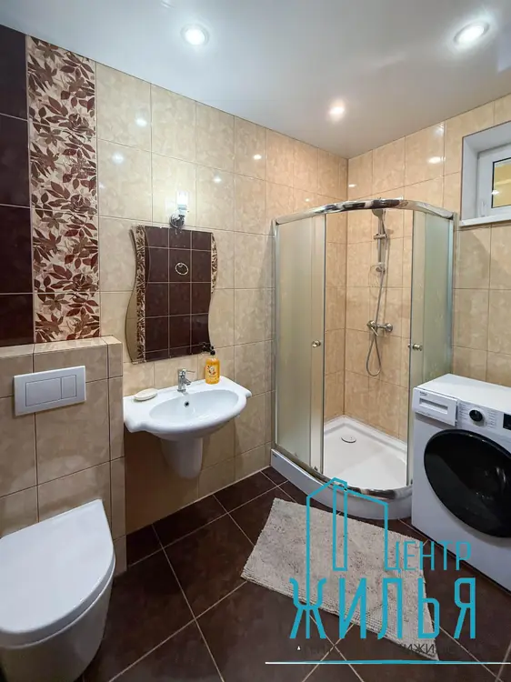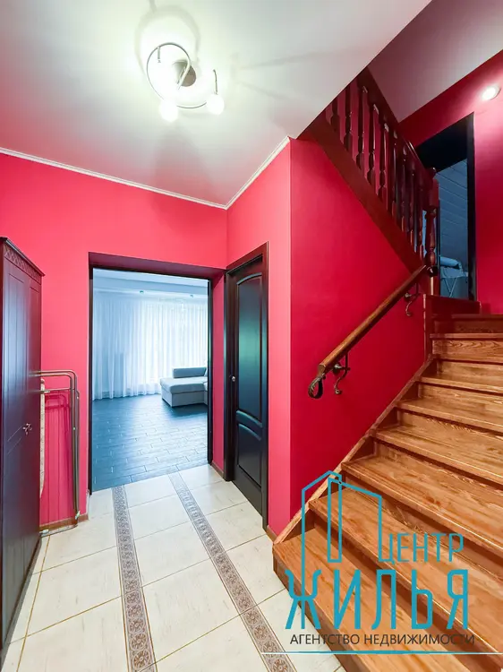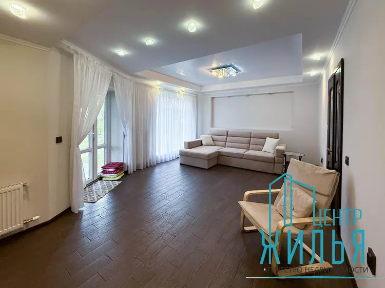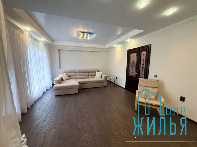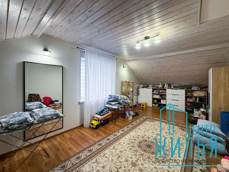 На первом этаже – просторная уютная гостиная, кухня, санузел, душевая. Два выхода – центральный и на задний дворик с выходом на террасу. На втором этаже – 4 жилых комнат, санузел, ванная комната. Имеется цокольный этаж, где расположены кладовые, котельная и гараж. Перед входом – парковка для автомобилей.