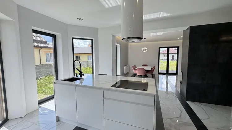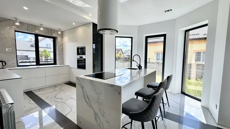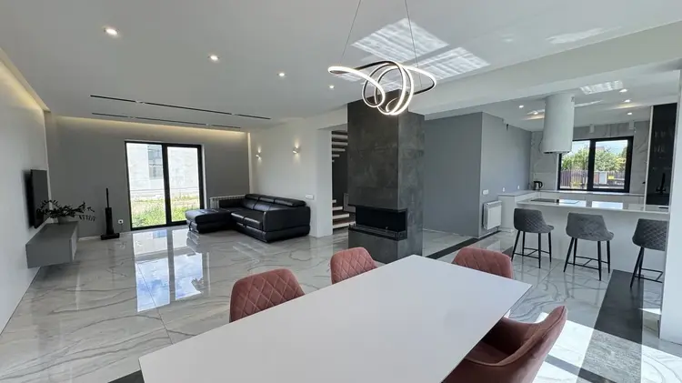 Общая площадь дома 180 м2, жилая 101,44 м2, кухня 22,91 м2., гараж 23,38 м2. Высота потолка от 3 метров. Материал наружных стен - керамзитобетонные блоки; перегородки – газосиликатные блоки; перекрытия – монолит. Дом оштукатурен внутри и снаружи под чистовую отделку. По периметру дома сделан дренаж. Окна - ПВХ. Крыша - металлочерепица. Электрика разведена по всему дому.