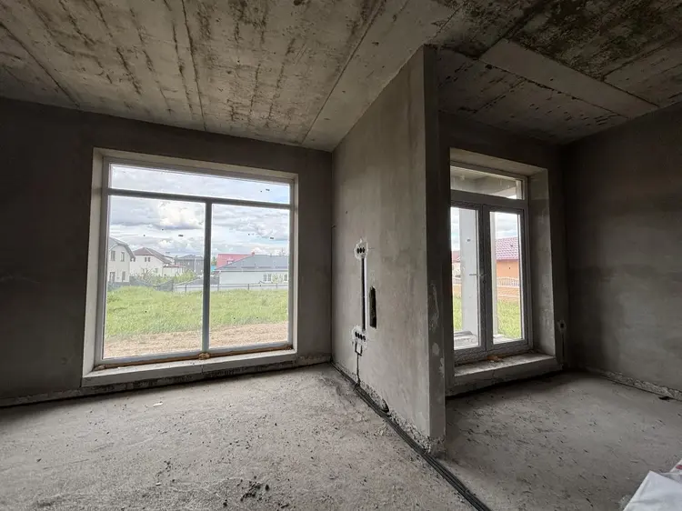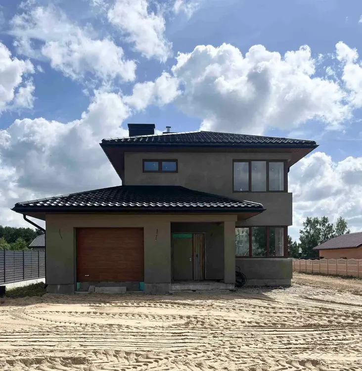 Общая площадь дома 180 м2, жилая 101,44 м2, кухня 22,91 м2., гараж 23,38 м2. Высота потолка от 3 метров. Материал наружных стен - керамзитобетонные блоки; перегородки – газосиликатные блоки; перекрытия – монолит. Дом оштукатурен внутри и снаружи под чистовую отделку. По периметру дома сделан дренаж. Окна - ПВХ. Крыша - металлочерепица. Электрика разведена по всему дому.