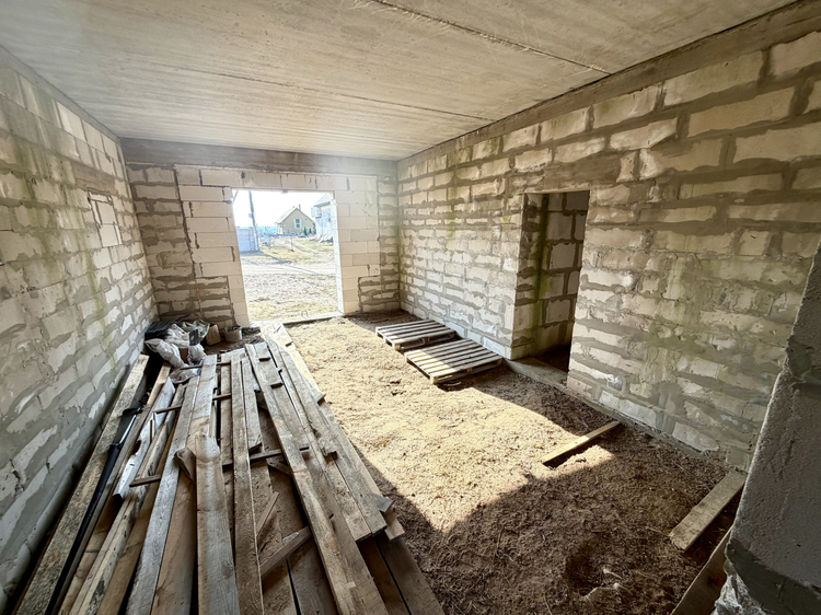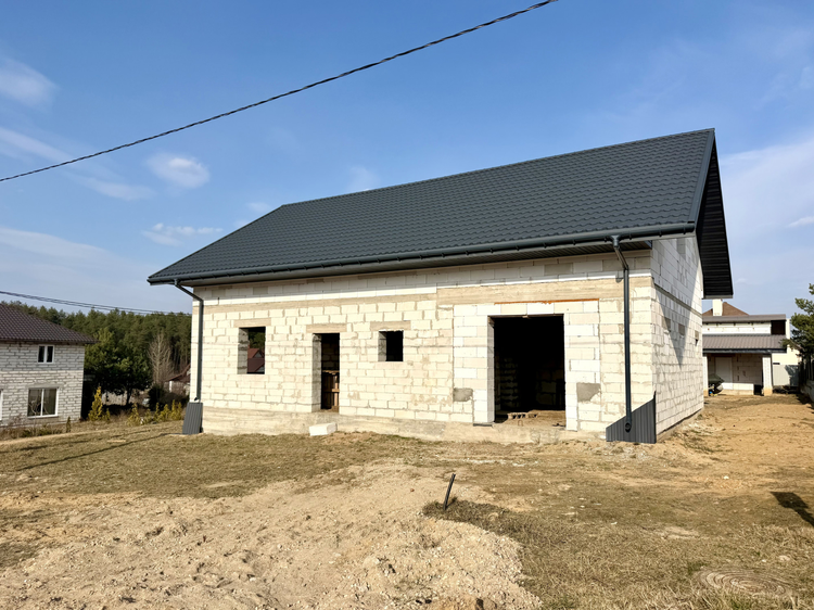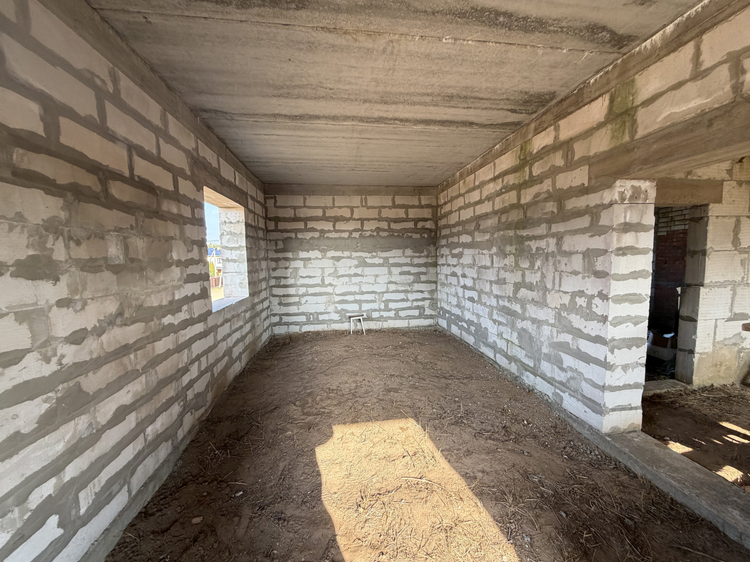 Общая информация о строении: незавершённое законсервированное капитальное строение представляет собой двухэтажный дом, общей площадью 200 кв.м. Проектом предусмотрена эффективная планировка: 1-ый этаж - просторная кухня-34 м2, гостиная-29,6 м2, топочная и гостевой санузел. На втором этаже предусмотрены 3 жилые комнаты (14,8м2, 14,6м2, 35,3м2) санузел и просторный холл. Фундамент – монолит. Стены – газосиликатный блок 40см. Перекрытия — ж/б плиты. Крыша – металлочерепица бельгийского производства. Частично возведены перегородки.
