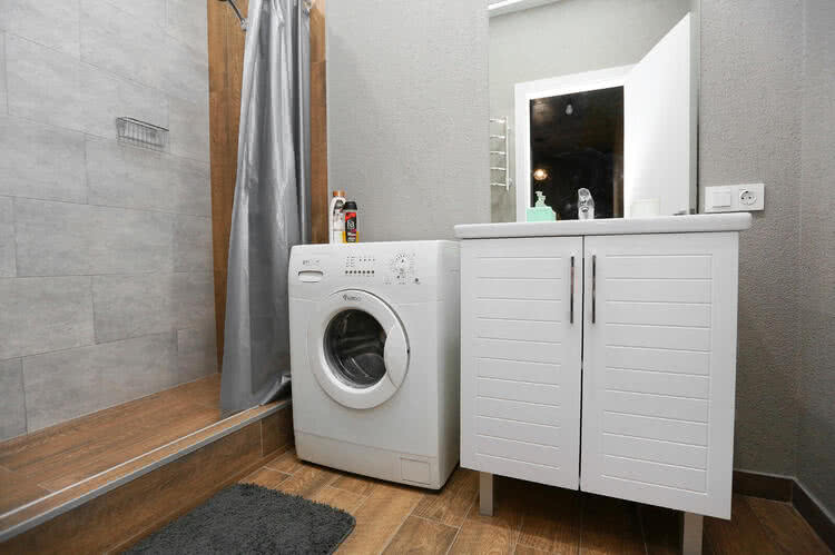 Ванная: душ, гель, шампунь, стиральная машина, утюг, гладильная доска, фен, туалетная бумага.