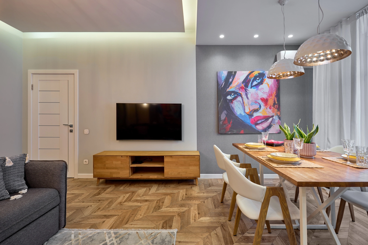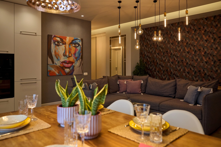 Двухкомнатная квартира в центре Гродно. Находится на третьем этаже четырехэтажного кирпичного дома. В апартаментах сделан современный дизайнерский ремонт с перепланировкой пространства. Гостиная совмещена с кухней; к ним примыкает смежная спальня с большой двуспальной кроватью; просторная ванна.