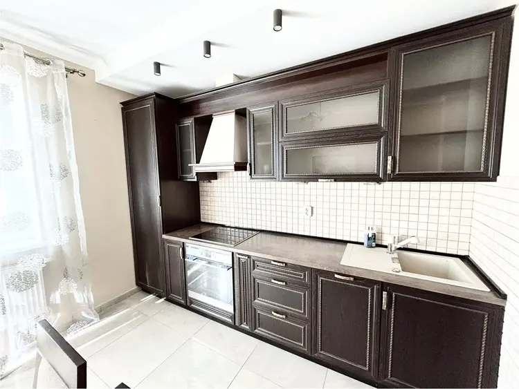 Встроенная кухня (массив) со всей необходимой бытовой техникой, включая варочную поверхность, духовой шкаф, посудомоечную машину. Вместительный шкаф-командор в прихожей. Межкомнатные двери – шпон.