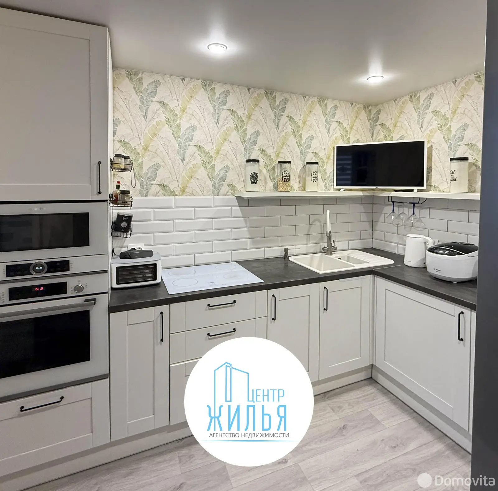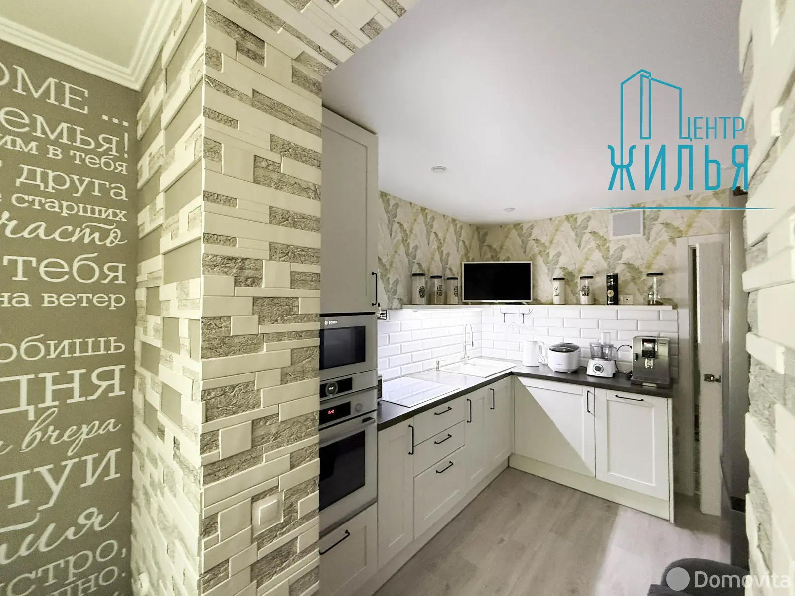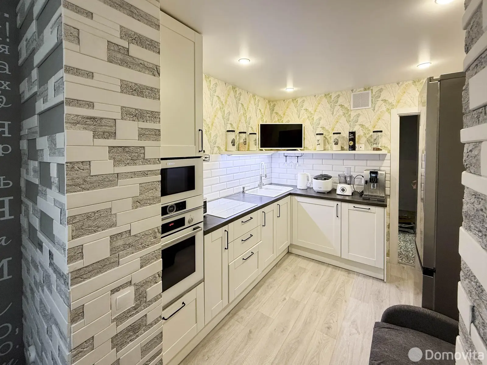 Кухня оборудована техникой Bocsh (духовой шкаф, электрическая варочная поверхность, встроенная СВЧ, посудомоечная машина).
