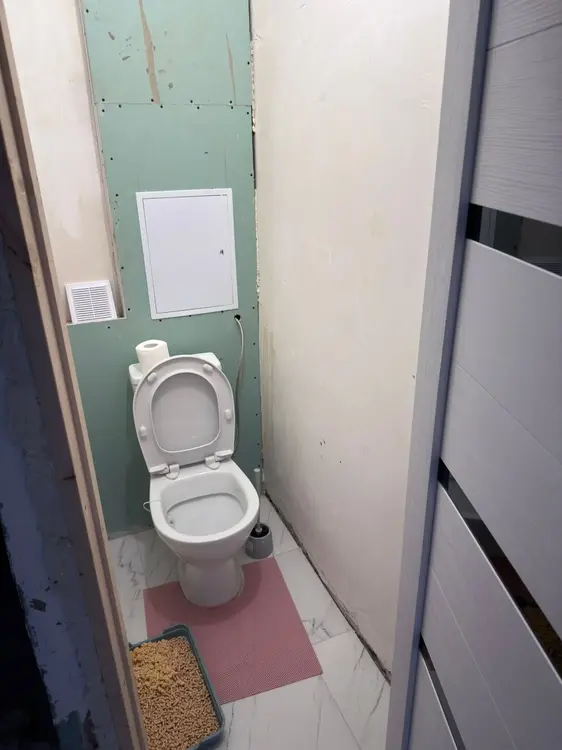 - Ванная и туалет — новые акриловые сантехнические изделия, на полу — керамогранит.
