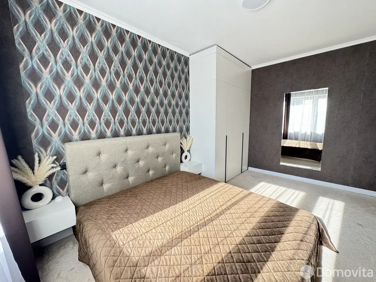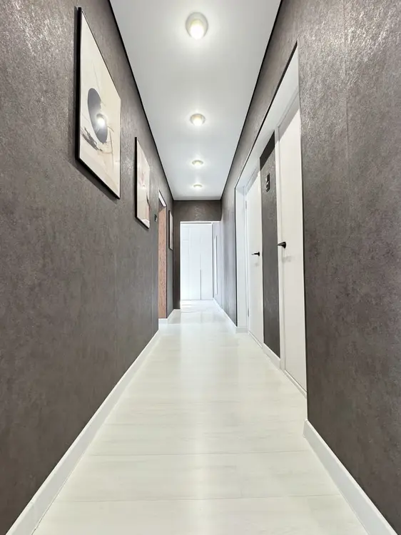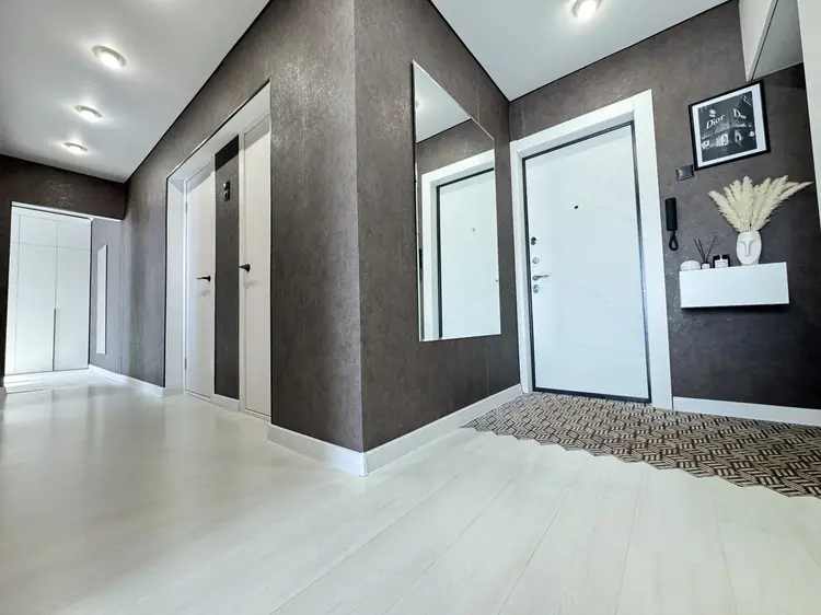 В гостиной и спальне установлены окна ПВХ, на полу уложен ламинат/ковровое покрытие, стены оклеены обоями, нанесена декоративная штукатурка, межкомнатные двери выполнены в едином стиле, потолки натяжные, только в спальне окрашены снежкой, входная дверь- металлическая, в коридоре и спальне оборудованы вместительные встроенные шкафы. Современный кухонный гарнитур оборудован бытовой техникой, укомплектован варочной панелью и холодильником и мечется выход на остекленную лоджию.