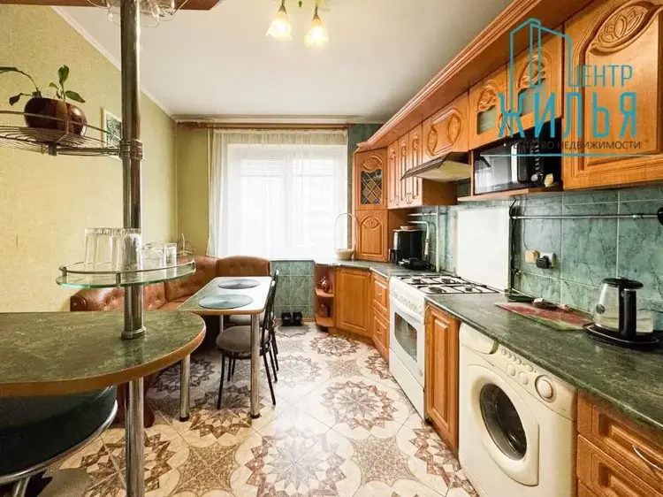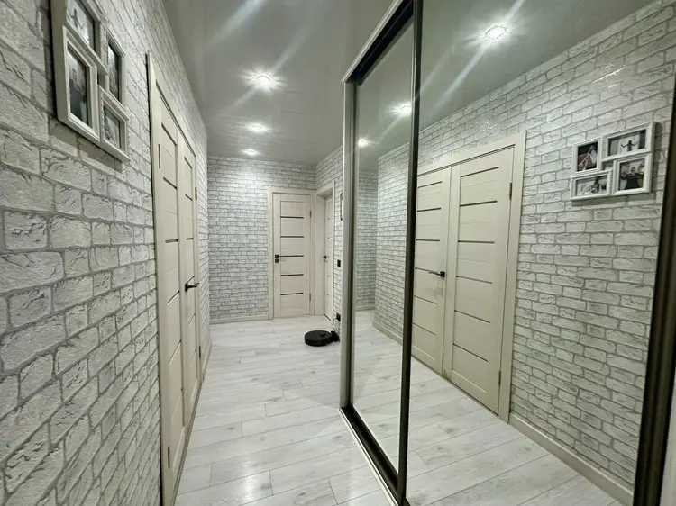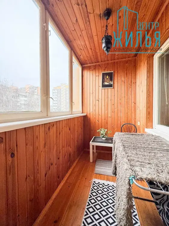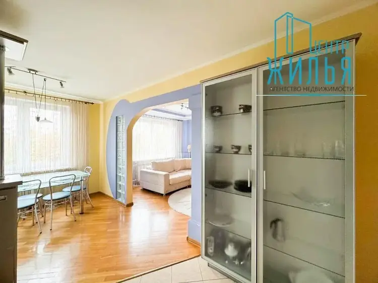 Окна — деревянные стеклопакеты. Входная металлическая дверь, комплект межкомнатных дверей. На полу ламинат, в кухне и санузлах — плитка. Стены оклеены обоями, потолки — оштукатурены, окрашены. Санузел раздельный, облицован плиткой. Две лоджии — остеклены. Встроенный шкафа-купе в прихожей.