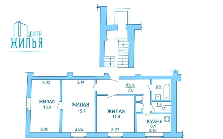 В квартире 3 жилые комнаты (15,7м2, 13,9м2 и 11,4 м2), одна из которых является проходной, раздельный санузел, отдельная кухня (6,1 м2). Балкона нет. Высокие потолки.
