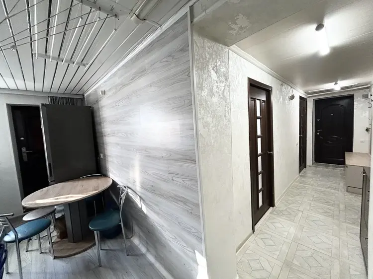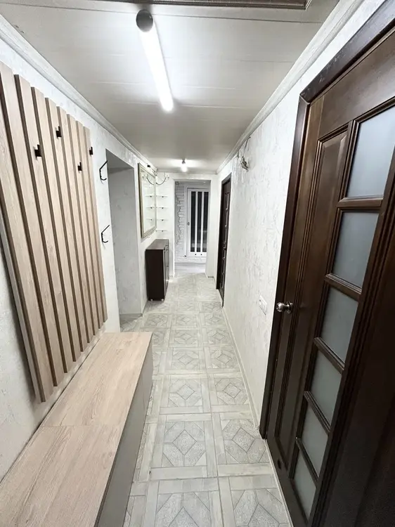 Пол в квартире – ламинат, в прихожей, веранде и коридоре - плитка. Стены – оклеены обоями, в кухне – декоративная штукатурка/ламинат. Два совмещенных санузла. Окна – стеклопакеты ПВХ. Металлические входные двери, межкомнатные двери в одном стиле. Из кухни имеется второй выход на улицу.
