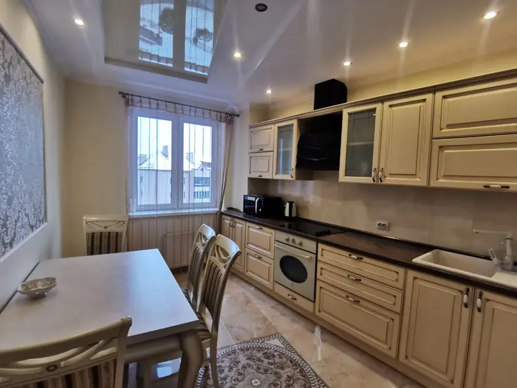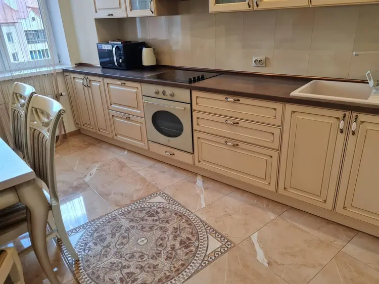 Установлены окна ПВХ и металлическая входная дверь. Межкомнатные двери из натурального дерева. На полу уложена паркетная доска и керамическая плитка. Кухня оборудованная всей необходимой бытовой техникой.