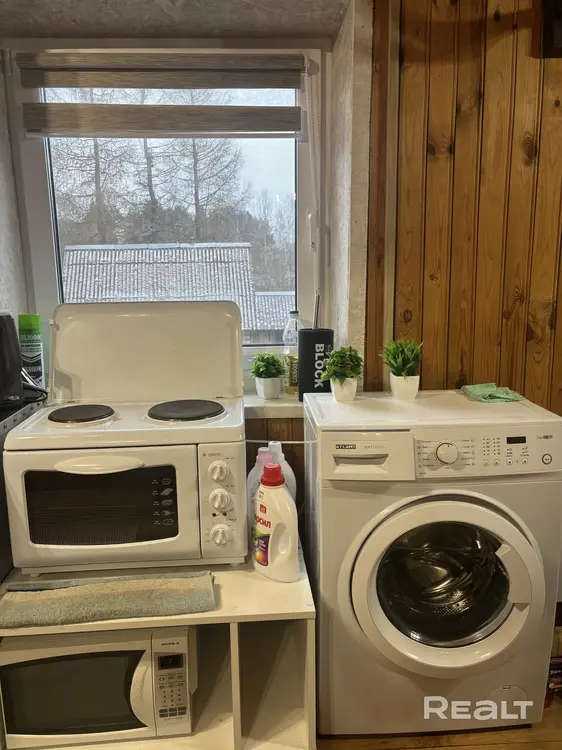 * Уютная светлая кухня оснащена удобной электроплитой, стиральной машиной и микроволновой печью.