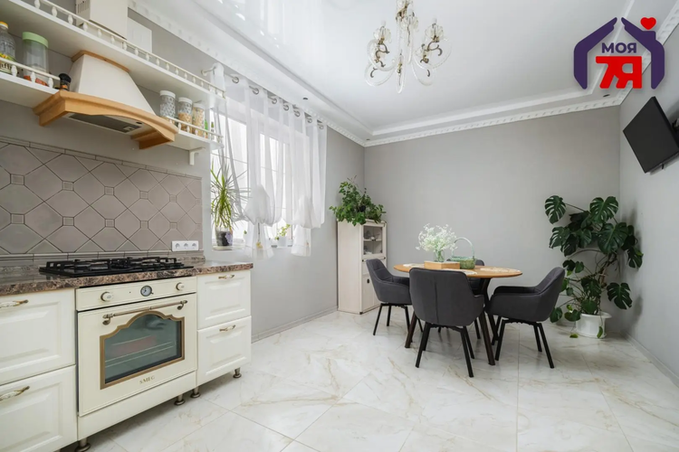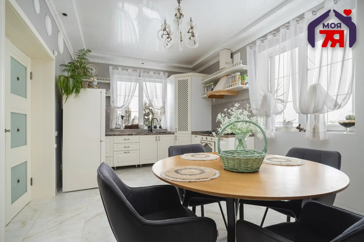 -Кухня оформлена в светлой, элегантной стилистике. Классический кухонный гарнитур с каменной столешницей, качественной фурнитурой и встроенной техникой выглядит стильно и актуально. Обеденная зона органично вписана в пространство, а за счёт окон и светлой отделки кухня всегда наполнена естественным светом. Это удобное и тёплое место для повседневной жизни и встреч с близкими.