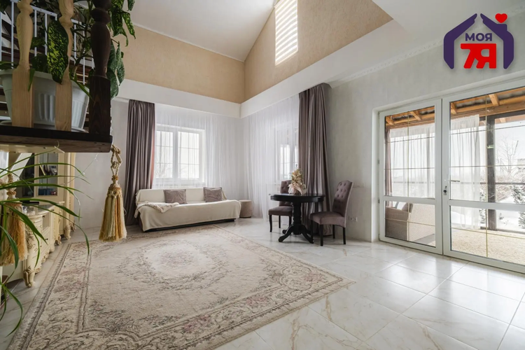 -Интерьер выдержан в спокойной, благородной палитре, с классическими формами и качественной мебелью, подчёркивающей статус дома. На полу - практичная плитка с мраморной фактурой, долговечная и уместная как с точки зрения эксплуатации, так и визуального восприятия, а также уложен качественный ламинат.