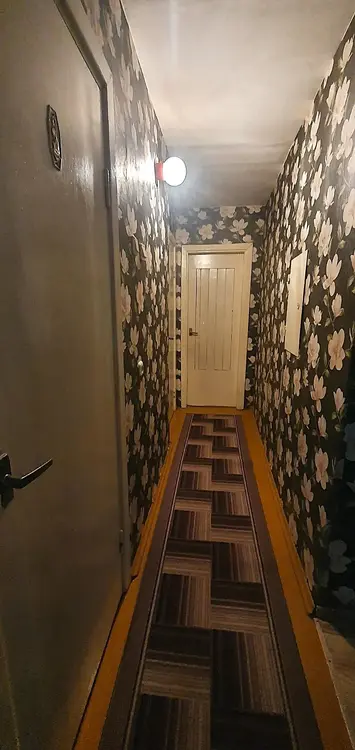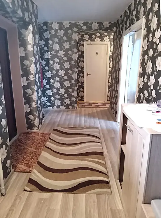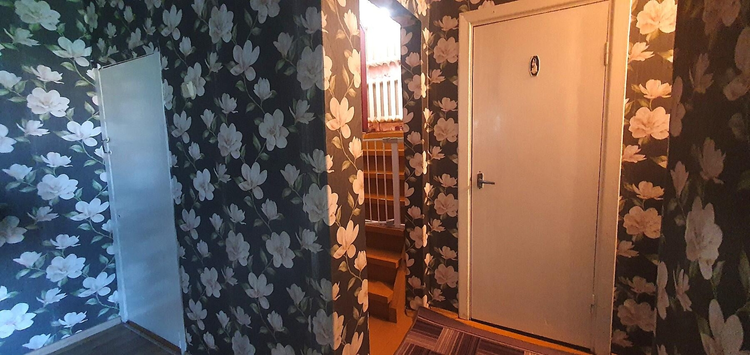 На полу крашенная доска (не скрипит); в оконных проёмах установлены двухкамерные стеклопакеты; межкомнатные двери массив; на стенах обои, в санузлах плитка.