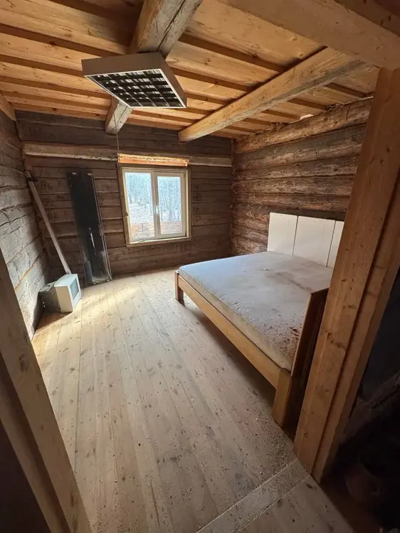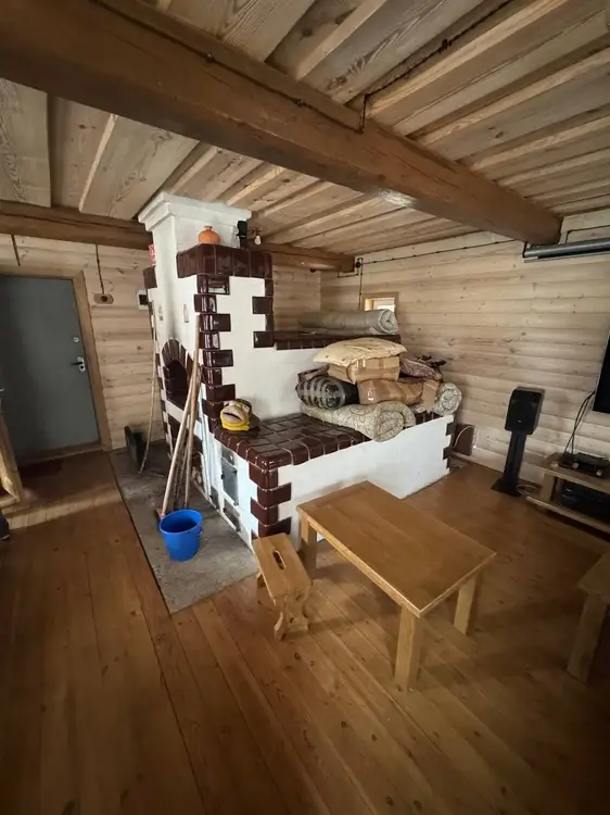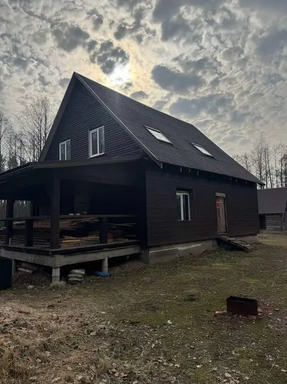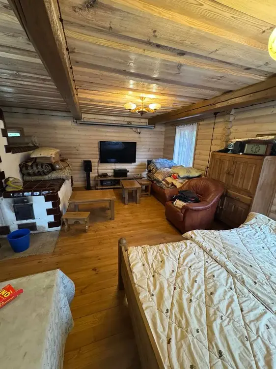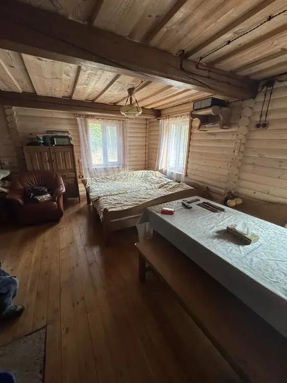 Дом бревенчатый, двухуровневый, с пристроенной террасой. Общая площадь — 86 кв. м, жилая — 48 кв. м, кухня — 19 кв. м, две большие комнаты. Крыша — ондулин. Входная и межкомнатные двери деревянные, окна со стеклопакетами, полы дощатые.