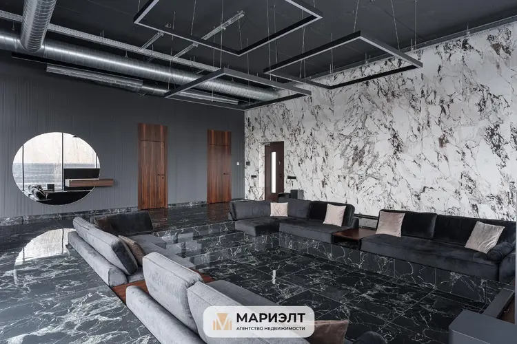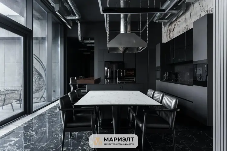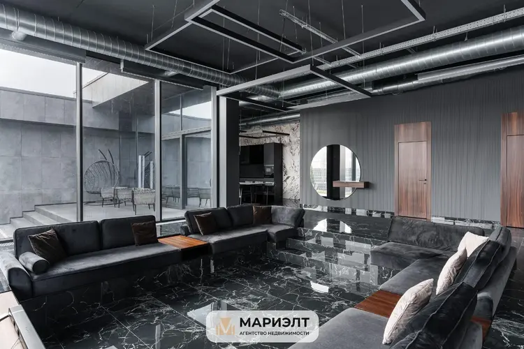 - Просторная гостиная с зоной кухни (114,8 кв.м.) с панорамными окнами и выходом на террасу.