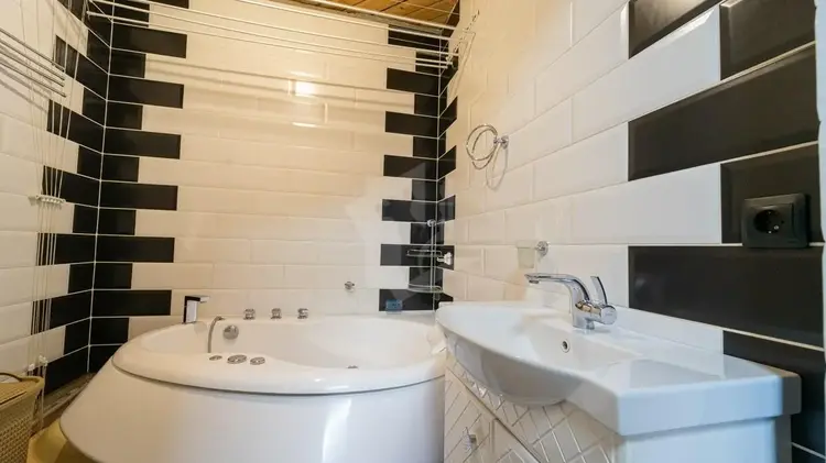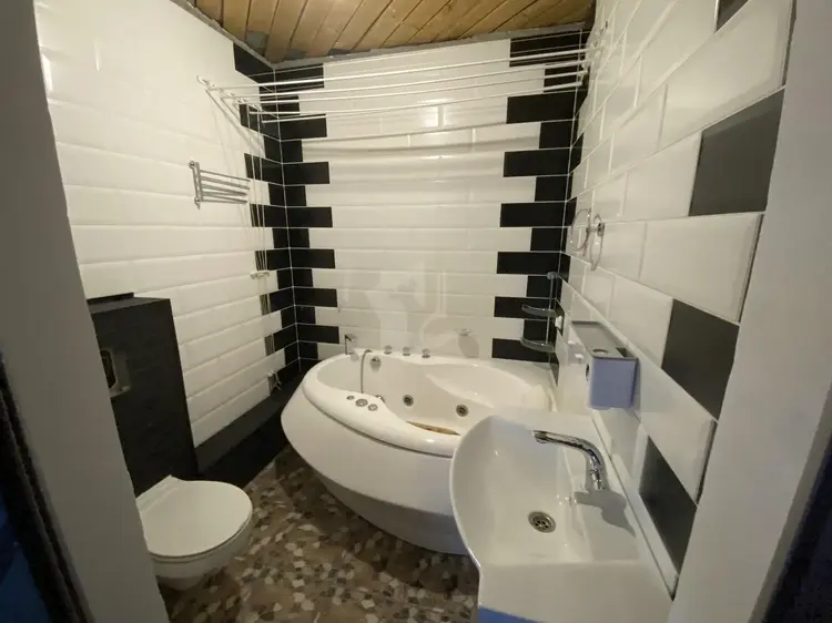 В ванной комнате, которая расположена в центре жилого этажа, установлена ванна джакузи. Пол и стены облицованы кафелем современных коллекций.