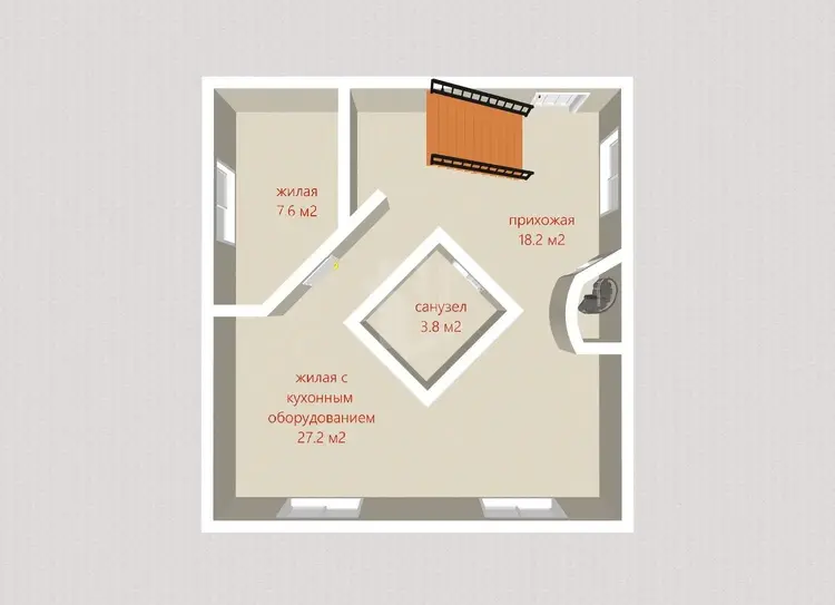 Первый этаж состоит из жилой комнаты с кухней (27,2 м2), комнаты (7,6 м2) и санузла (3,8 м2).