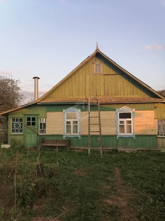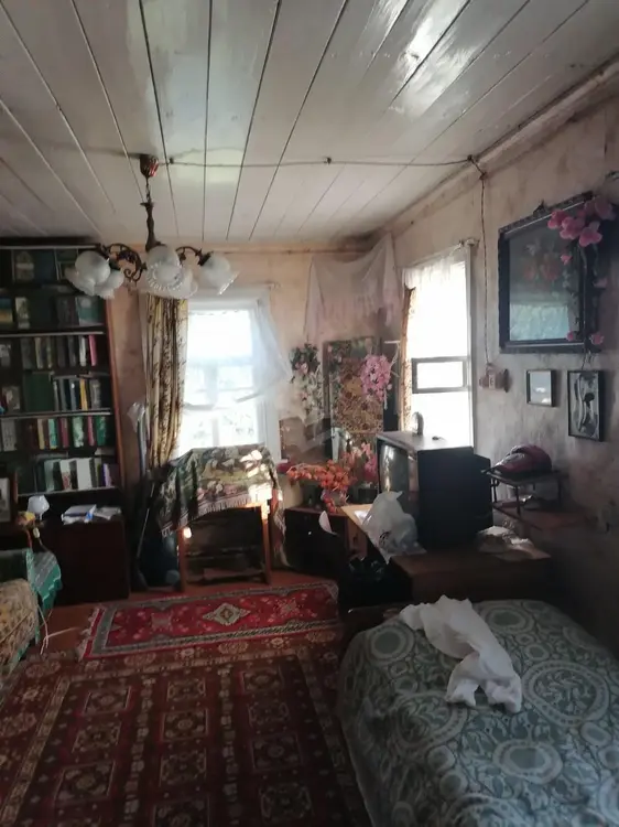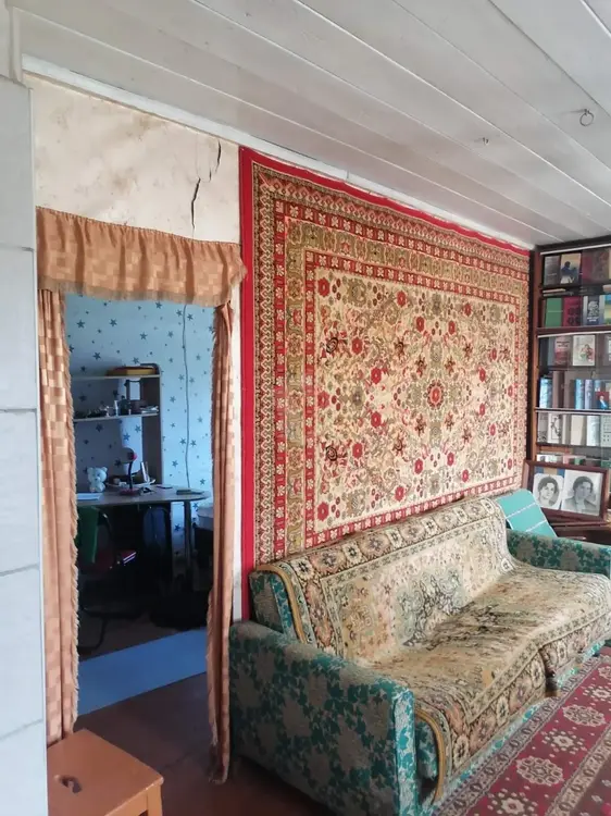 Дом построен из бруса,обшит доской.Печное отопление.На 1/3 постоянно проживают соседи,с которыми комнаты дома разделены по договоренности на личные комнаты разных хозяев и общего пользования-кухня и прихожая.