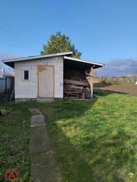 На участке сарай для инструмента, высажены яблони, малина, ежевика.