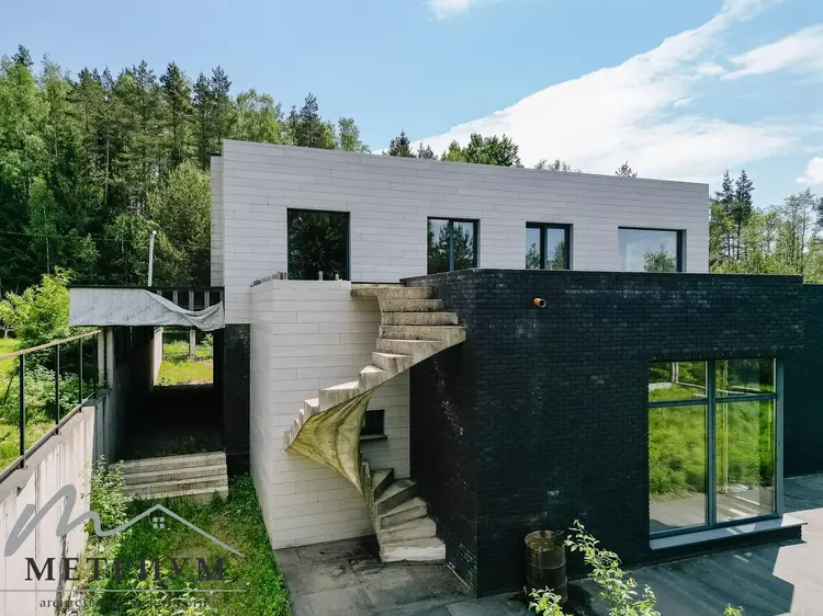 Стены дома выполнены из керамического кирпича, утеплены и облицованы испанской плиткой в комбинации с черным клинкером ручной формовки. Окна в доме деревянные, а снаружи в алюминиевом исполнении.