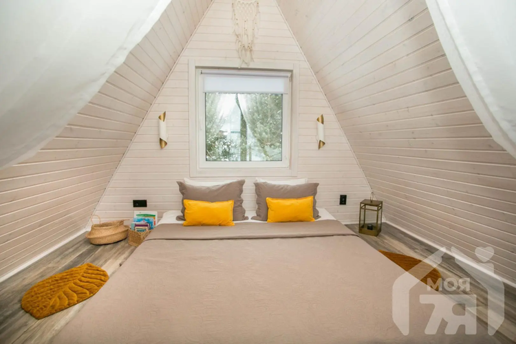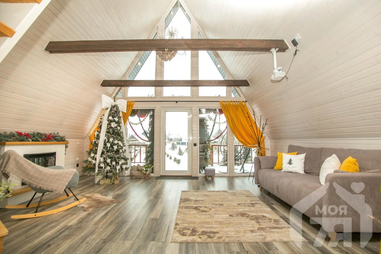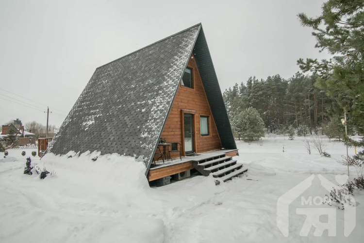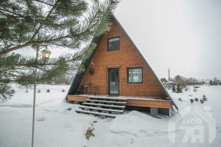 -Основной дом выполнен в формате A-frame - архитектуре, где форма работает на ощущение уюта, света и близости к природе. Общая площадь 59 кв.м. с двумя террасами 26 метров. Высокий фасад с панорамным остеклением наполняет пространство естественным светом и визуально стирает границу между интерьером и окружающим лесом. Конструкция дома продумана и добротна, с аккуратной террасой и удобным входом, который сразу задаёт атмосферу уединённого загородного отдыха.
