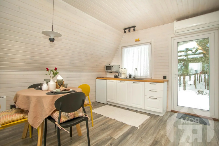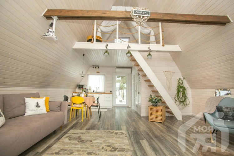 -Второй дом выполнен в стиле современной белорусской избы и органично дополняет основной. Общая площадь 45 кв.м., площадь террасы 24 кв.м. Он также двухэтажный: гостиная с кухней на первом уровне и уютная спальня на втором. В доме оборудованы душевая и санузел, рядом с домом отдельный чан для отдыха. Это полноценное автономное пространство, которое можно использовать для гостей или сдачи в аренду.