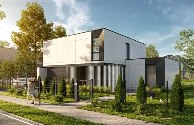 Фасады оформлены облицовкой из металлических панелей либо сочетанием плитки под кирпич с алюминиевыми композитными элементами, что придаёт дому современный и выразительный облик. Наружные стены выполнены из керамзитобетонных блоков толщиной 300 мм, усилены монолитными колоннами, фасад утеплён минераловатными плитами по технологии «вентилируемый фасад». Внутренние перегородки выполнены из керамического кирпича. Кровля — плоская, в сочетании с лаконичным стилем дома.