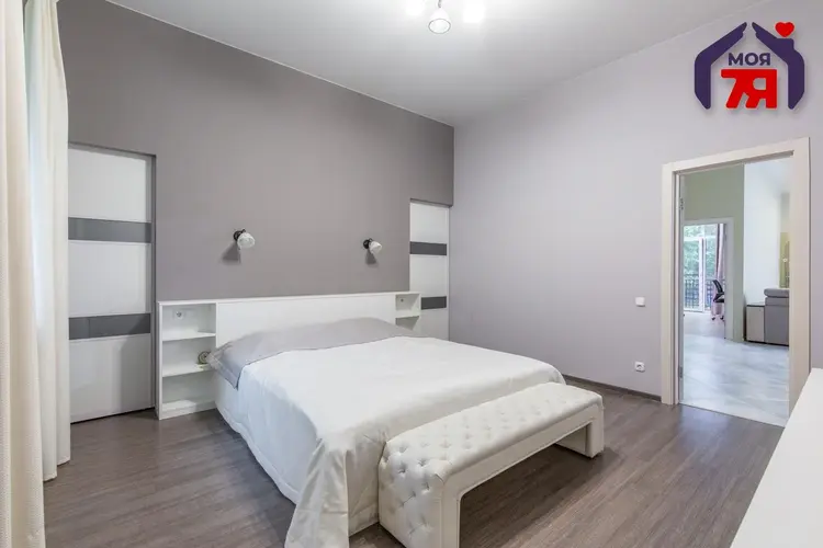 - Просторная входная группа с зимним садом; просторная кухня; гостиная с выходом на террасу; 2 спальные комнаты, одна из них - с личной гардеробной; 2 санузла: один объединен с душевой, второй санузел объединен с ванной.