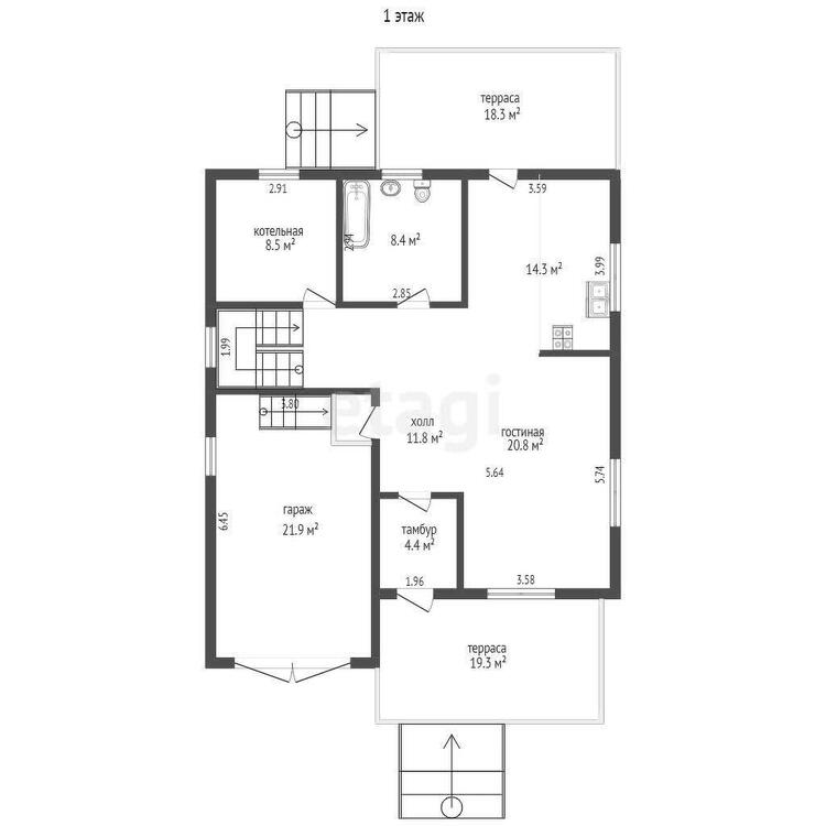 • Просторная терраса (19,4м2) с выходом в тамбур(4,4м2)