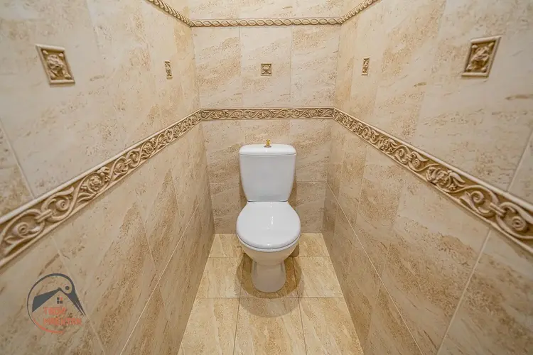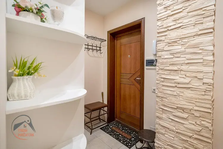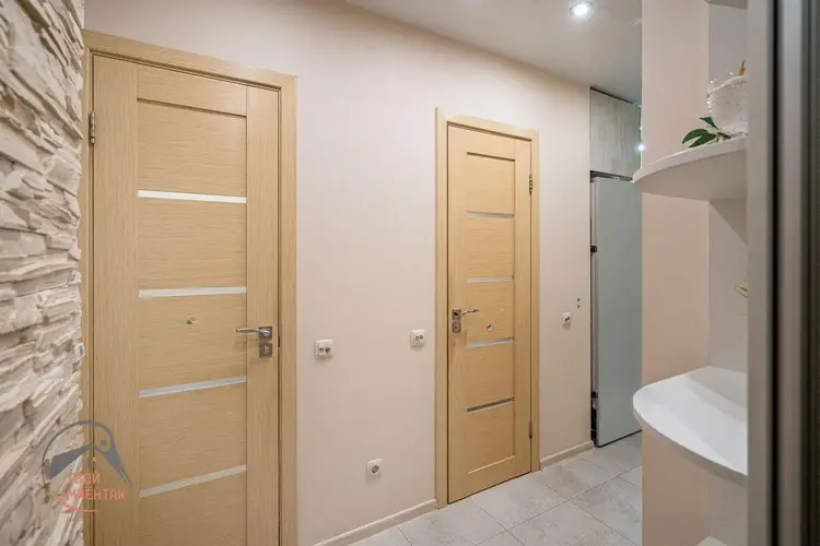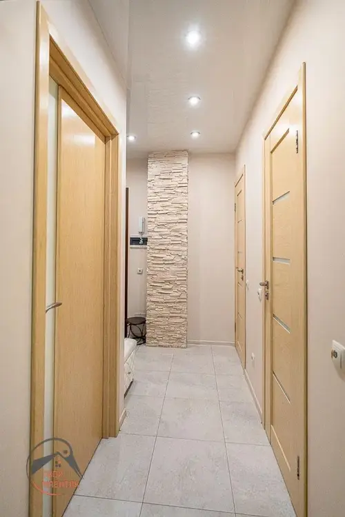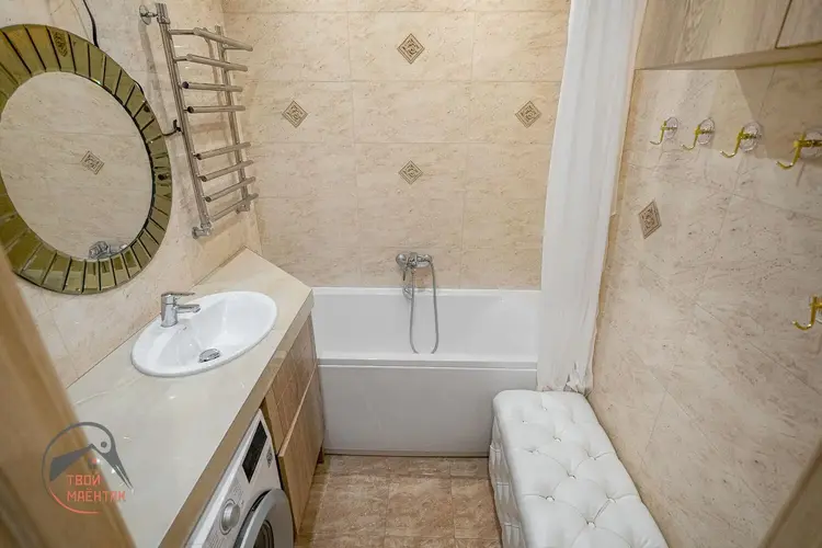 При ремонте использованы качественные импортные отделочные материалы: итальянская и чешская плитка, моющиеся обои, натяжные потолки (в комнате - тканевые), сантехника Roca, техника Bosh. Жилая комната удачно зонирована.