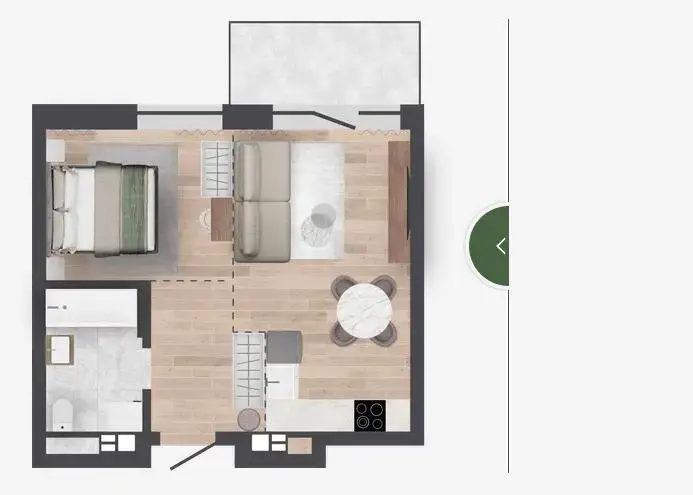 Квартиры с террасами на 1-м этаже площадью от 18 до 28 кв.м — полноценные террасы с видом в зеленый коридор и во двор.