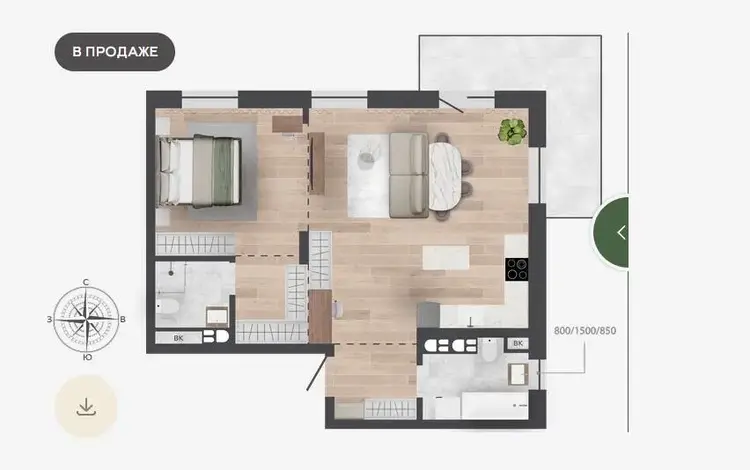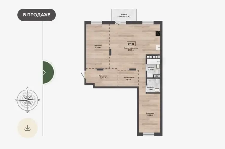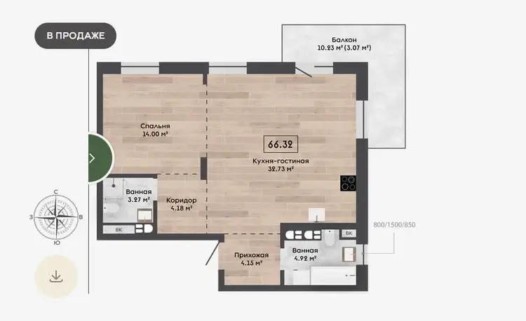 Метраж квартиры: по СНБ (с учетом балкона) — 36,42 м2; общий — 35,34 м2; жилые зоны (с учетом кухни-гостиной) — 27,8 м2.