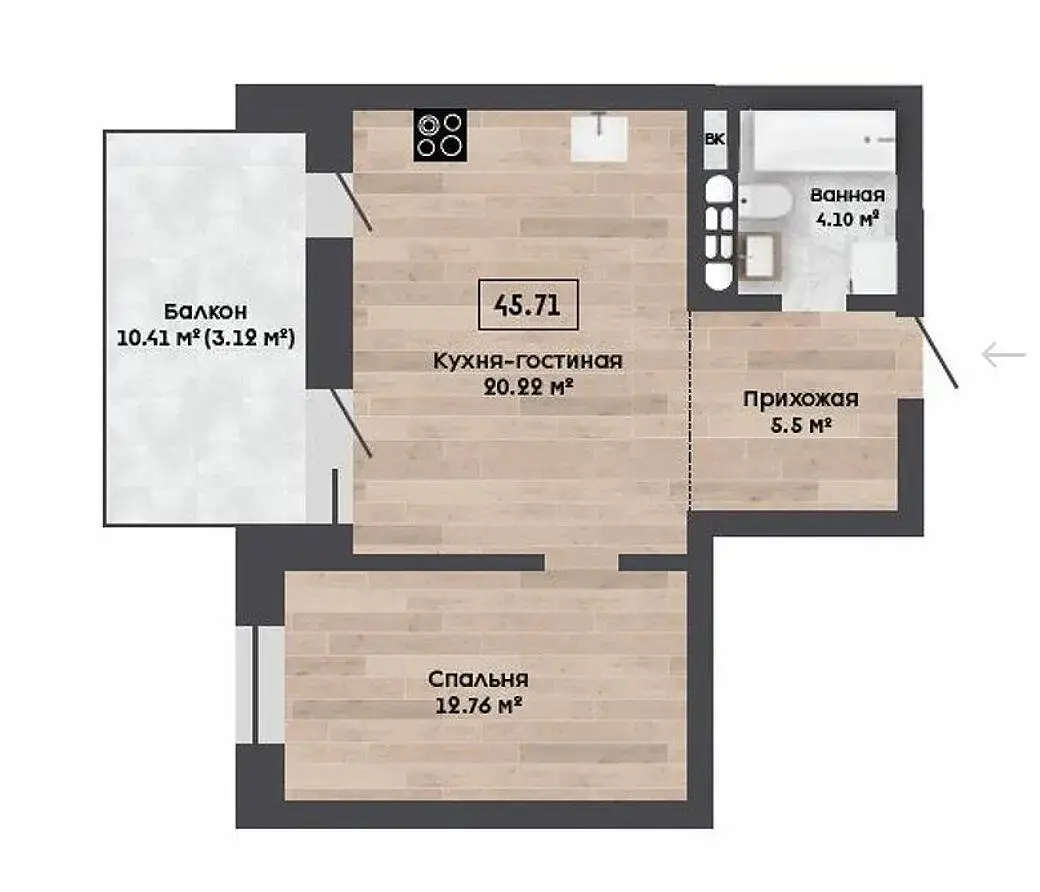 Современная планировка-отдельная спальня и просторная кухня-гостиная с выходом на балкон/террасу, с которой открывается замечательный вид.