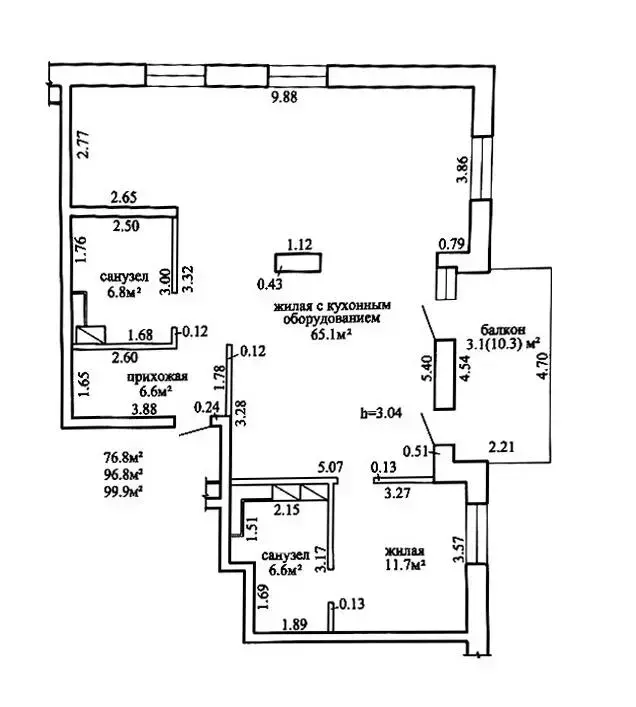 Общая площадь по СНБ 45,8 м2, общая площадь 42,6 м2.