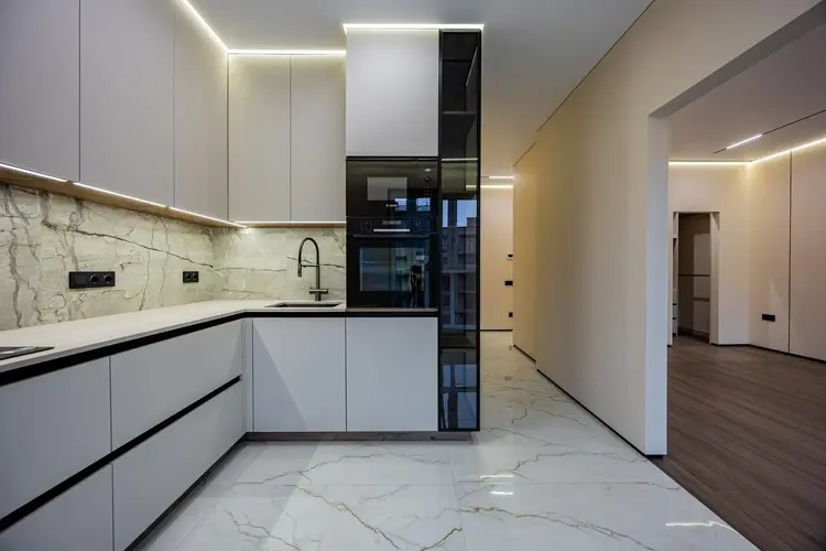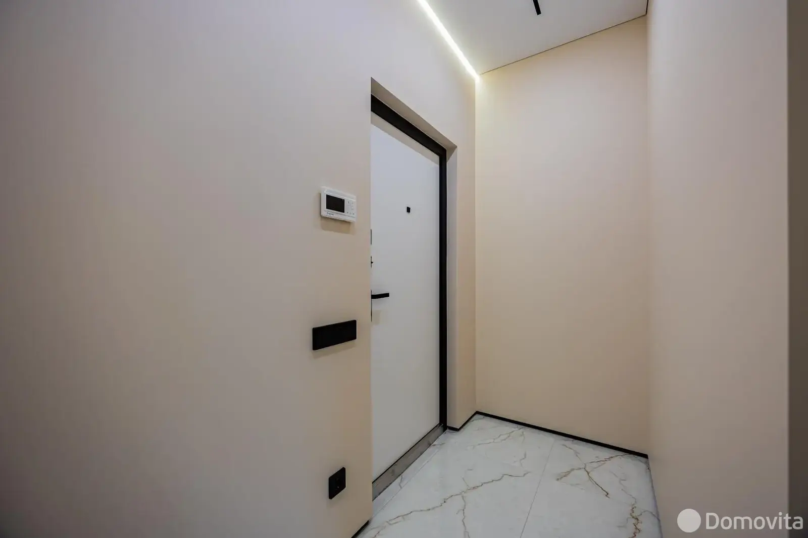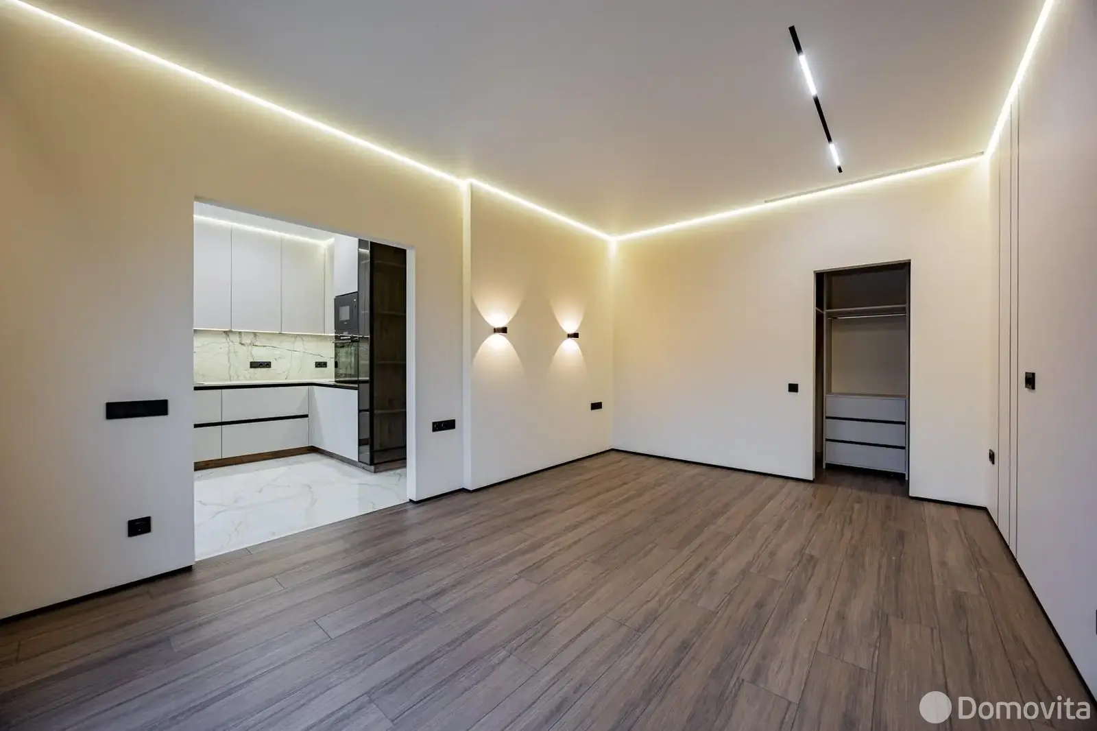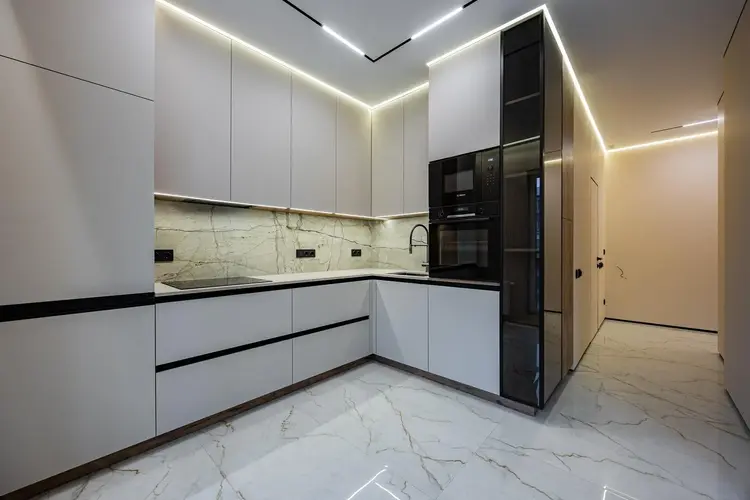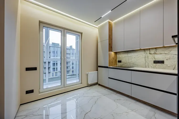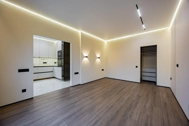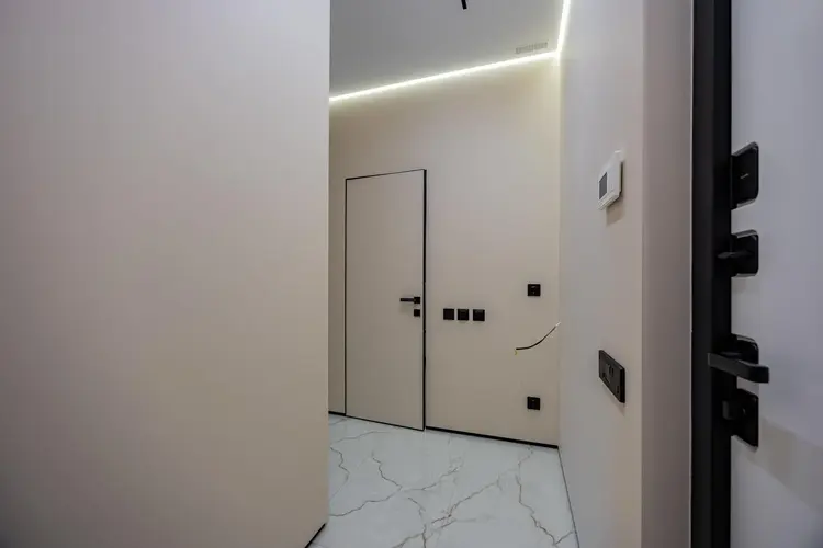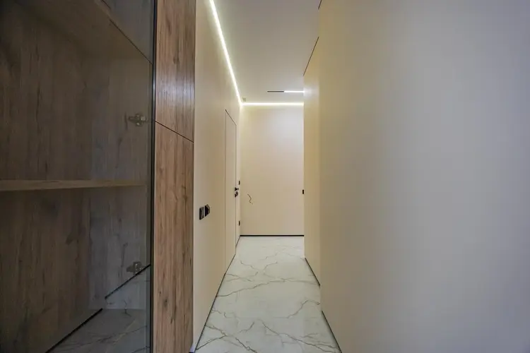 ∙ На полу в коридоре и кухне-гостиной итальянская плитка (теплый пол), стены выровнены и окрашены декоративной краской. Изолирована спальня с гардеробной комнатой. Потолки с теневым профилем, оригинальное освещение, плинтуса скрытого монтажа.
