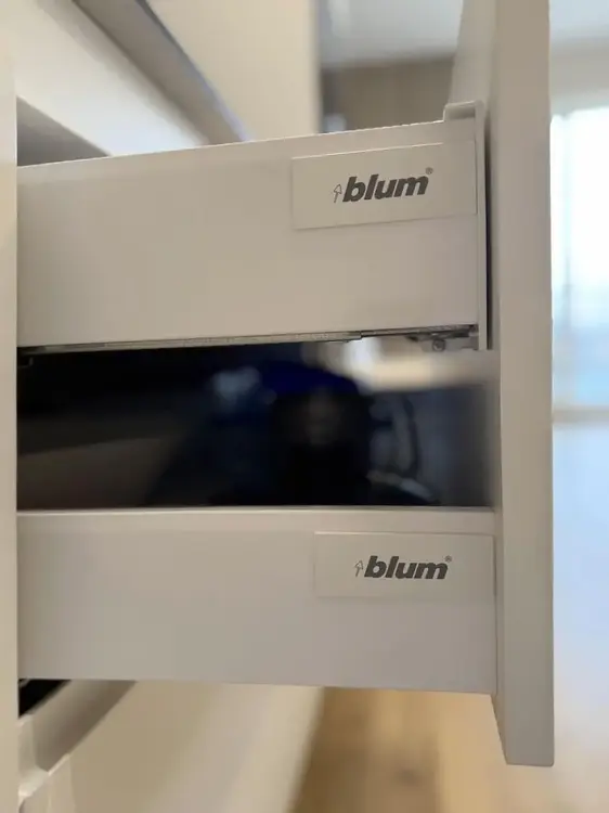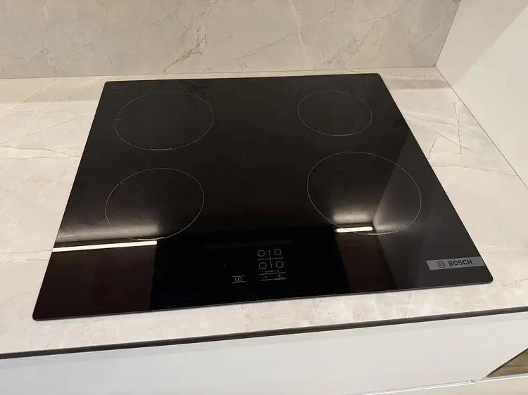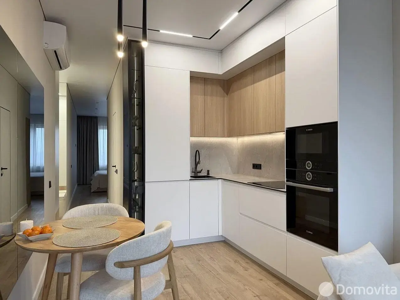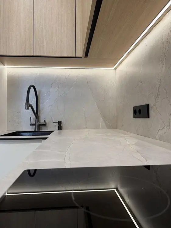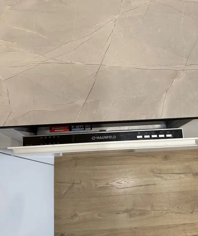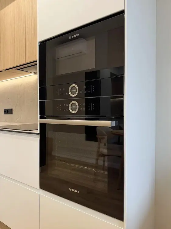 Встроенная кухня с фасадами из крашенного МДФ, доводчиками Blum, подсветкой рабочей зоны, столешницей из компакт-плиты и техникой (индукционная варочная поверхность, духовой шкаф и встроенная СВЧ-печь Bosch, посудомоечная машинка Maunfeld встроенный холодильник и вытяжка).