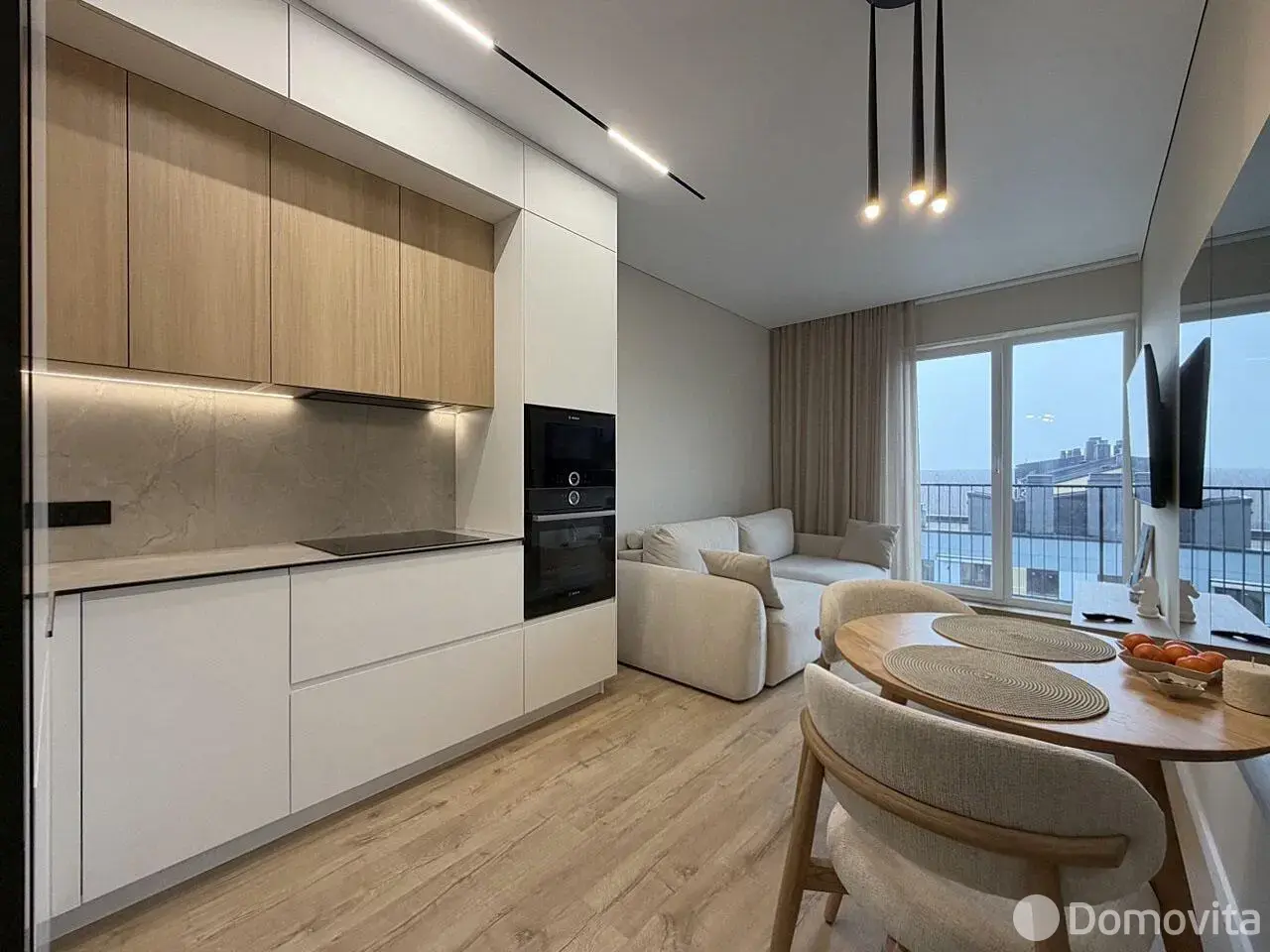 Гостиная оснащена обеденной группой, комфортным диваном, тумбой под TV, телевизором LGс диагональю «55» дюймов и кондиционером Gree. Вам точно понравится, что кухня-гостиная имеет выход на балкон, который оснащён электрической маркизой.