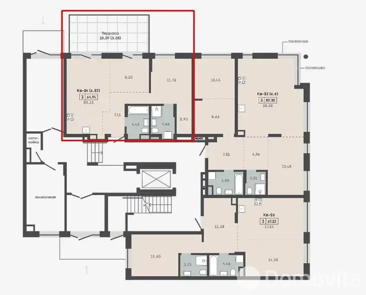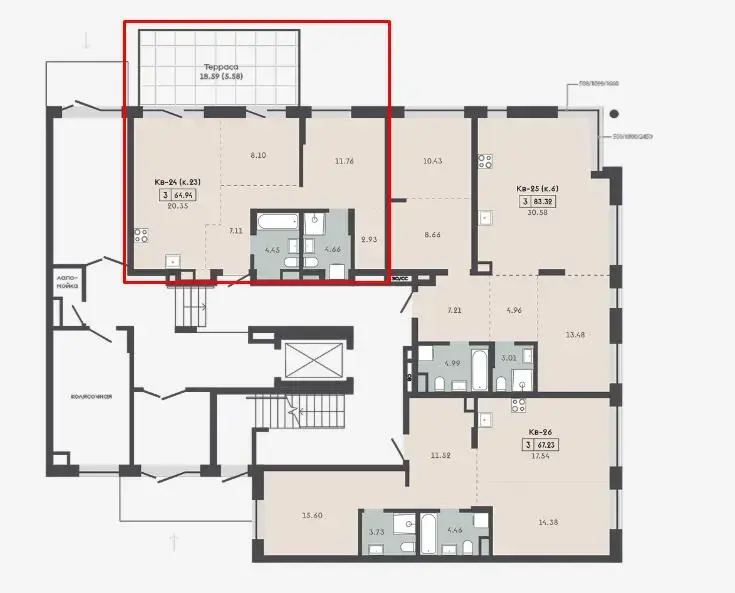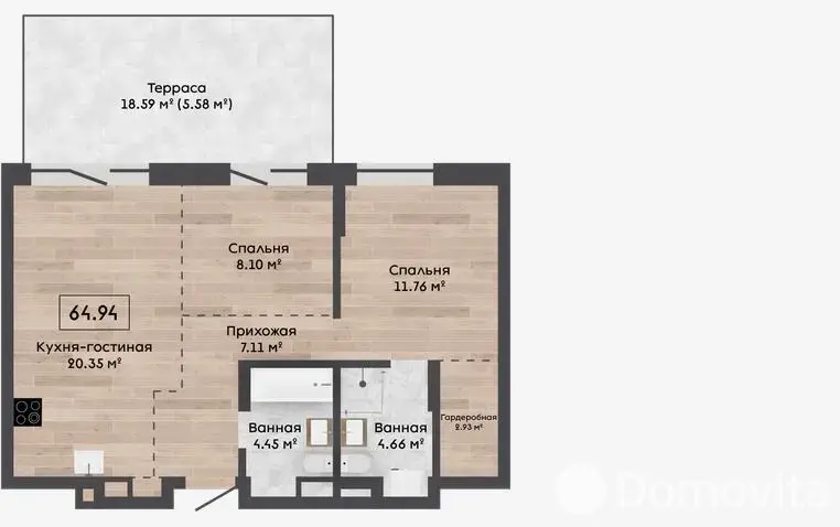 Квартира с террасой 18,59м2 и кладовой 4,81м2.