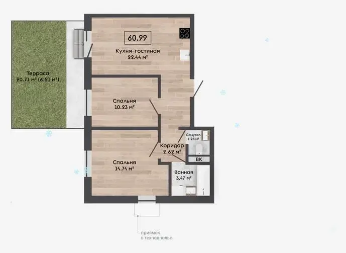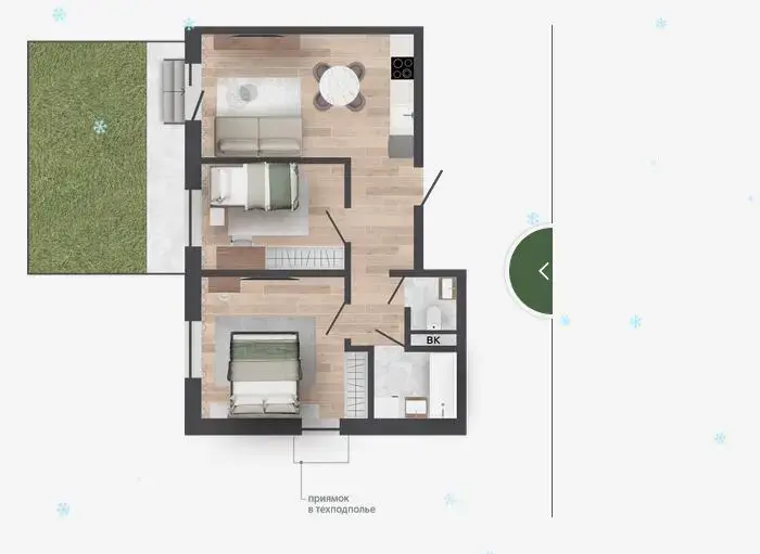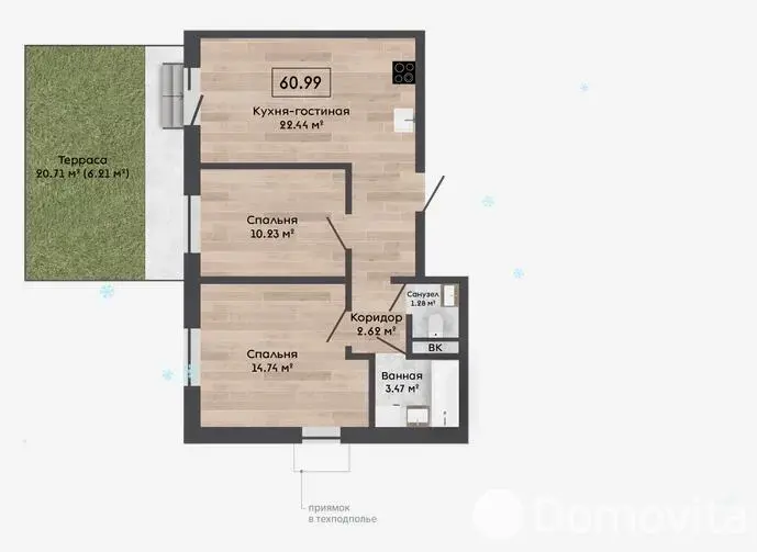 Квартира с участком на первом этаже 20.71м2 и отделка White Box Basic, кладовая 4.09м2.
