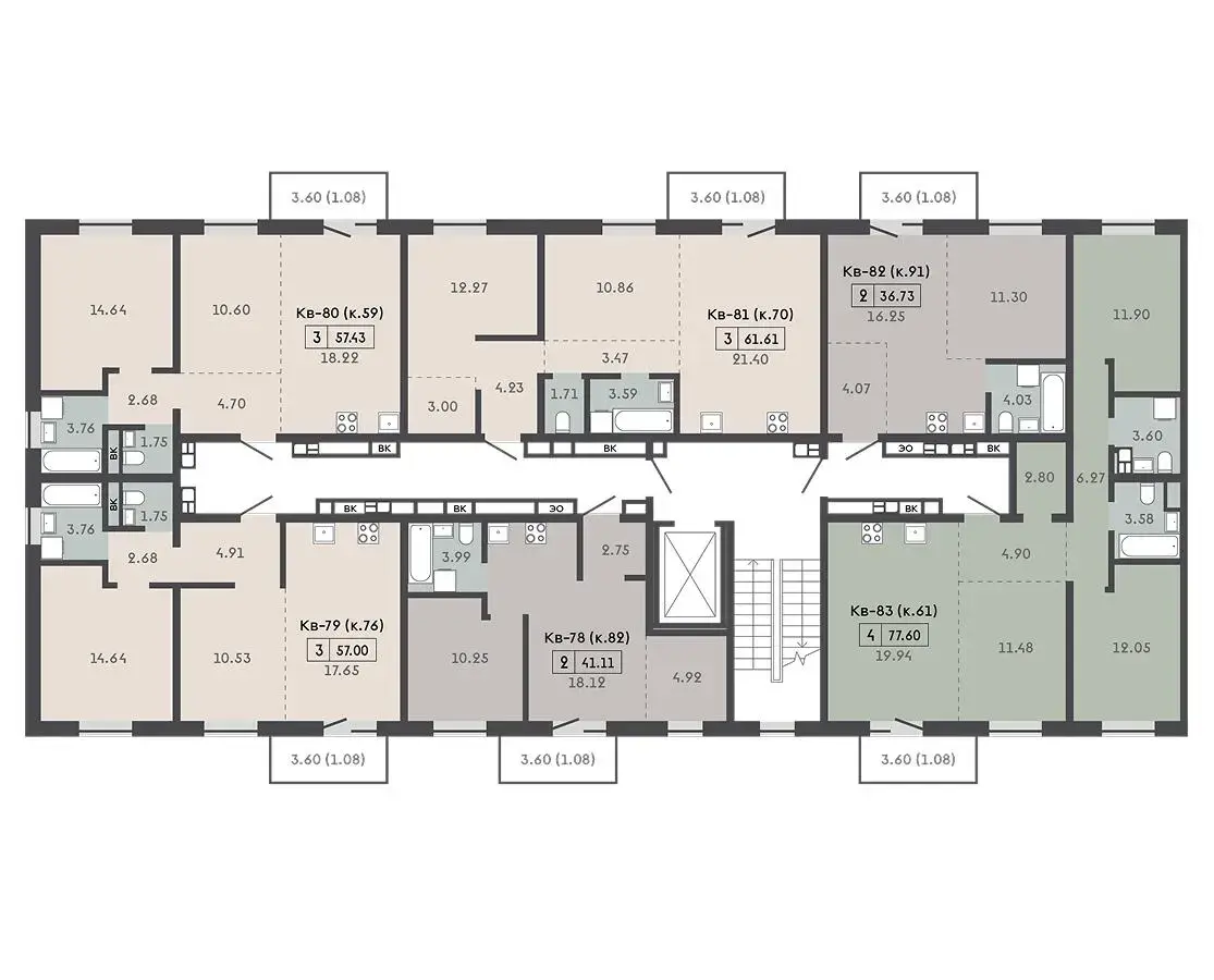 Проект включает три подъезда разной этажности (6, 7 и 8 этажей), в которых представлено 104 квартиры различных планировок — от компактных евродвушек до просторных пятикомнатных квартир площадью до 153,1 квадратного метра. Особое внимание уделено качеству внутреннего пространства: каждая квартира обладает просторной мастерской спальней, отдельными гардеробными зонами и большими открытыми балконами, создающими ощущение расширения жилого пространства.