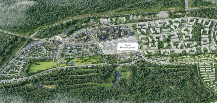 - Дом расположен в квартале «Горный ручей». Одним фасадом полностью ориентирован на южную сторону, с видом на таунхаусы и гольф-поля.