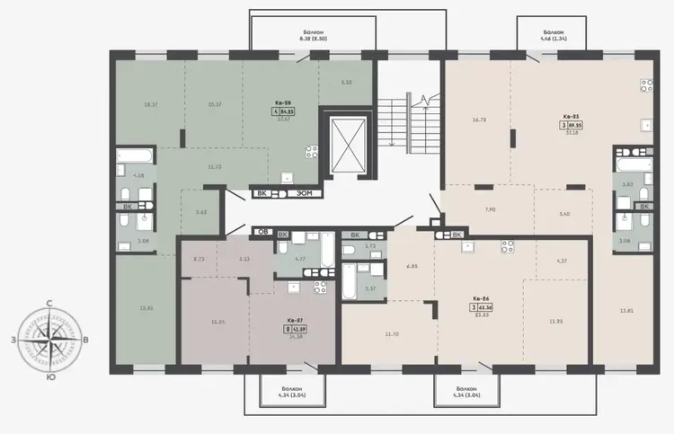 - 3 подъезда 6-5-6 этажей.