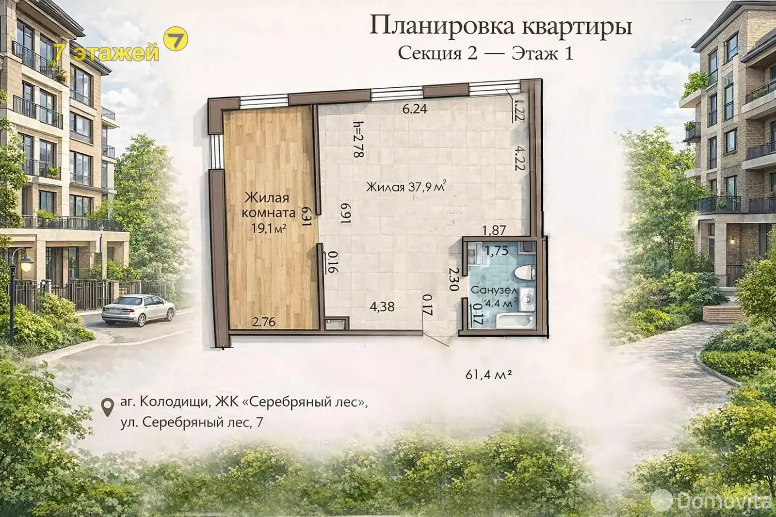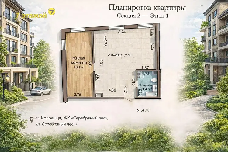 Продаётся современная квартира в новом доме 2024 г. аг. Колодищи, ЖК "Зелёная Гавань", ул. Серебряный лес, 7.Ситихаус 7.13. Площадь квартиры 61,4 м2.
