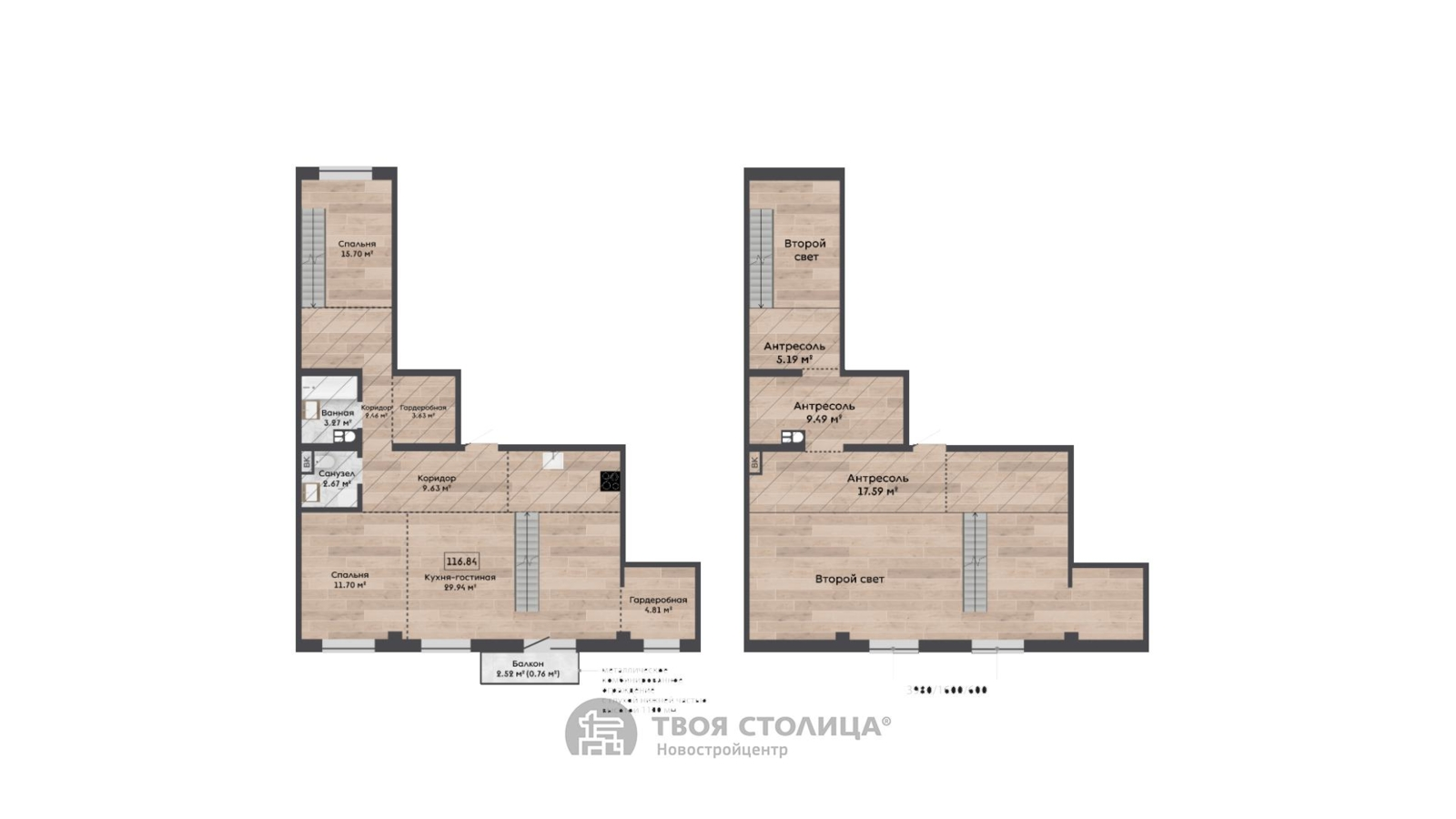 Мансардная квартира с антресольным этажом и вторым светом. Высота помещения от 2,9 до 7.7м.