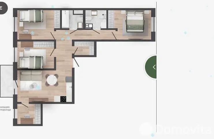 Квартиры на 1 этаже с личными участками-террасами с видом во двор и зеленый коридор.