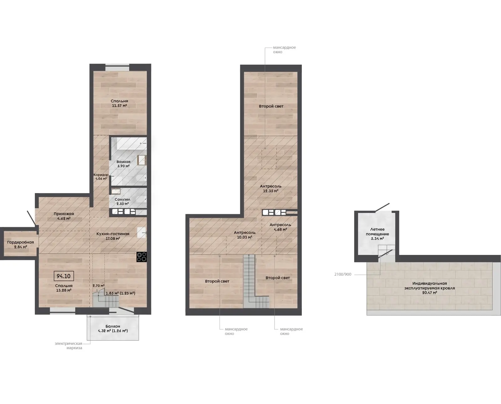 Просторная 4-комнатная квартира с мансардой и террасой на крыше. Высокие потолки и большое количество естественного света создают ощущение простора и уюта.