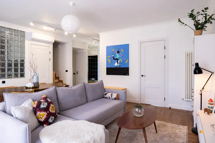 Гостиная оснащена комфортным диваном, подвесной тумбой под TV и телевизором Samsung с диагональю 65 дюймов (все провода спрятаны в кабель-канал).