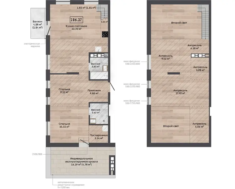 - Оконные проёмы с низкой подоконной частью: 500 мм.