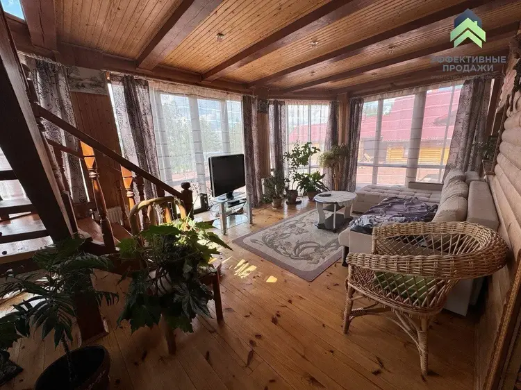- Коттедж построен из высококачественного экологичного дерева, что обеспечивает превосходные теплоизоляционные свойства и создаёт атмосферу уюта и близости к природе. Внутреннее пространство также оформлено деревянной обшивкой, подчёркивая целостность архитектурного решения.